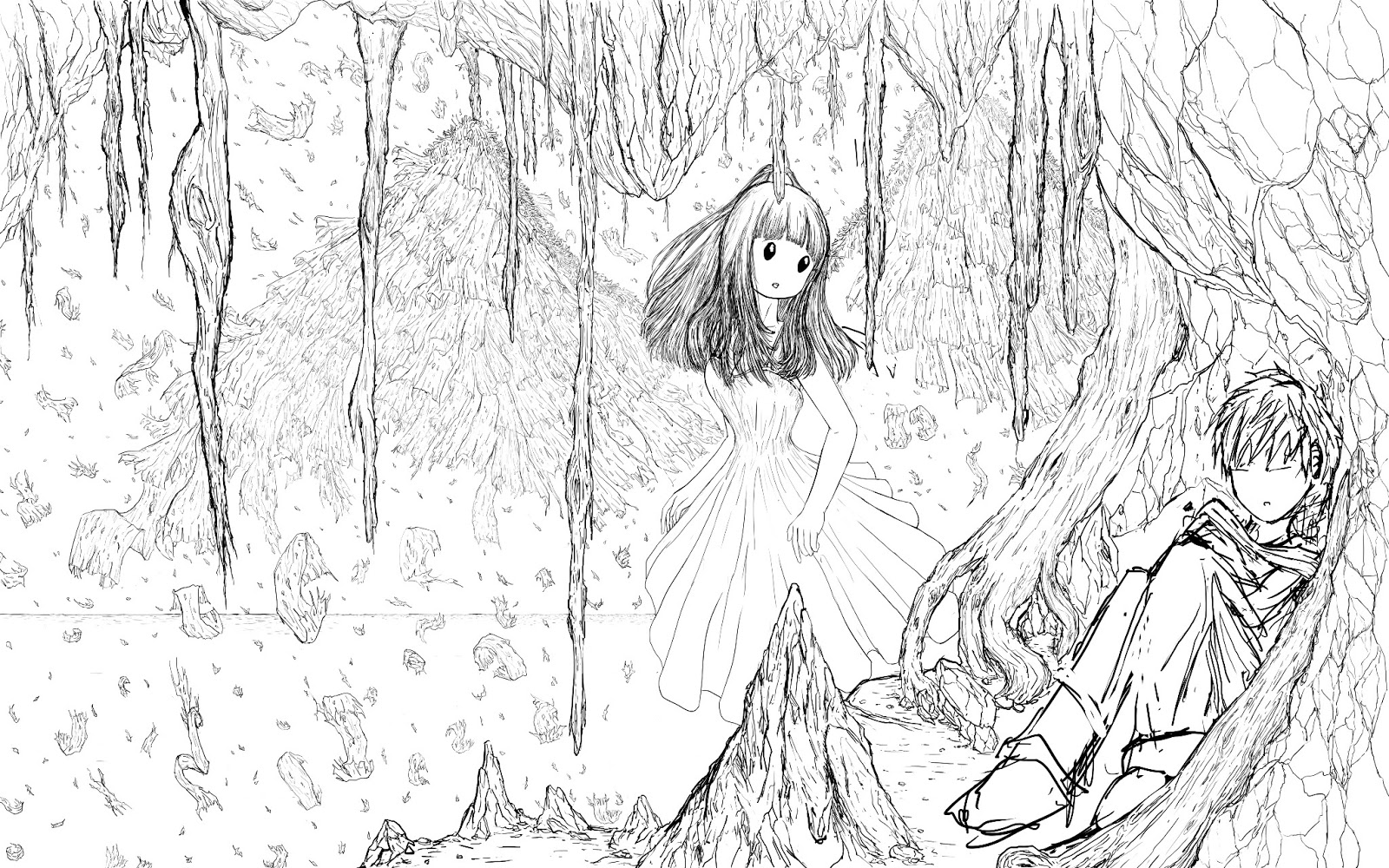 修饰更多细腻的细节,例如衣服上的碎片,岩石细节等,黑白稿完成。